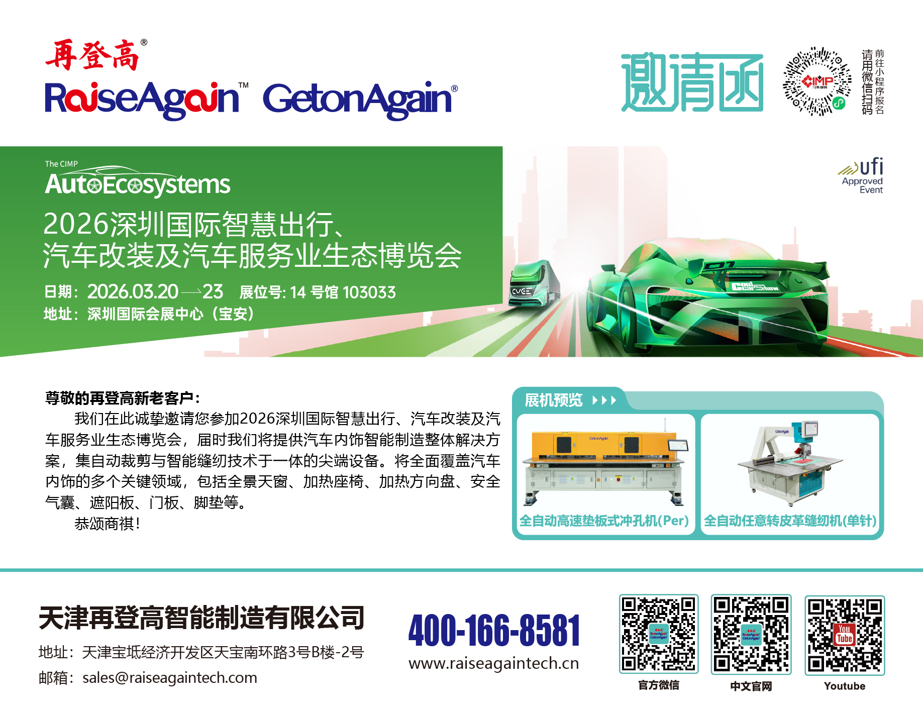 尊敬的再登高新老客户:我们在此诚挚邀请您参加第二十届上海国际汽车内饰与外饰展览会,届时我们将提供汽车内饰智能制造整体解决方案,集自动裁剪与智能缝纫技术于一体的尖端设备。将全面覆盖汽车内饰的多个关键领域...